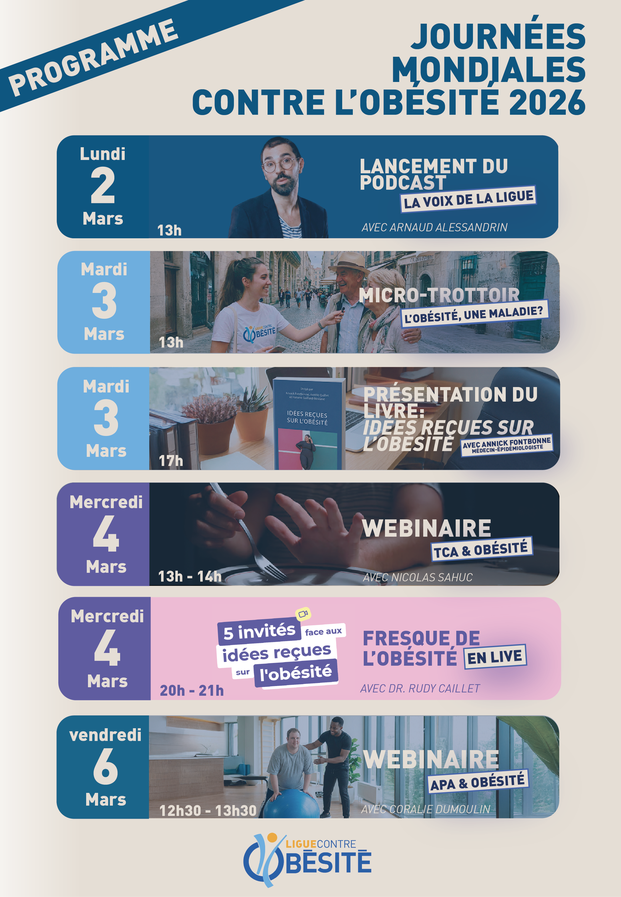Mardi 3 mars, de 13 h à 14 h Cette enquête auprès du grand public recueille des témoignages spontanés afin de mieux comprendre les représentations sociales de l’obésité. L’objectif est de questionner les stéréotypes persistants et d’ouvrir le débat sur la reconnaissance de l’obésité comme maladie complexe, multifactorielle et chronique.Présentation du livre Idées reçues sur l’obésité